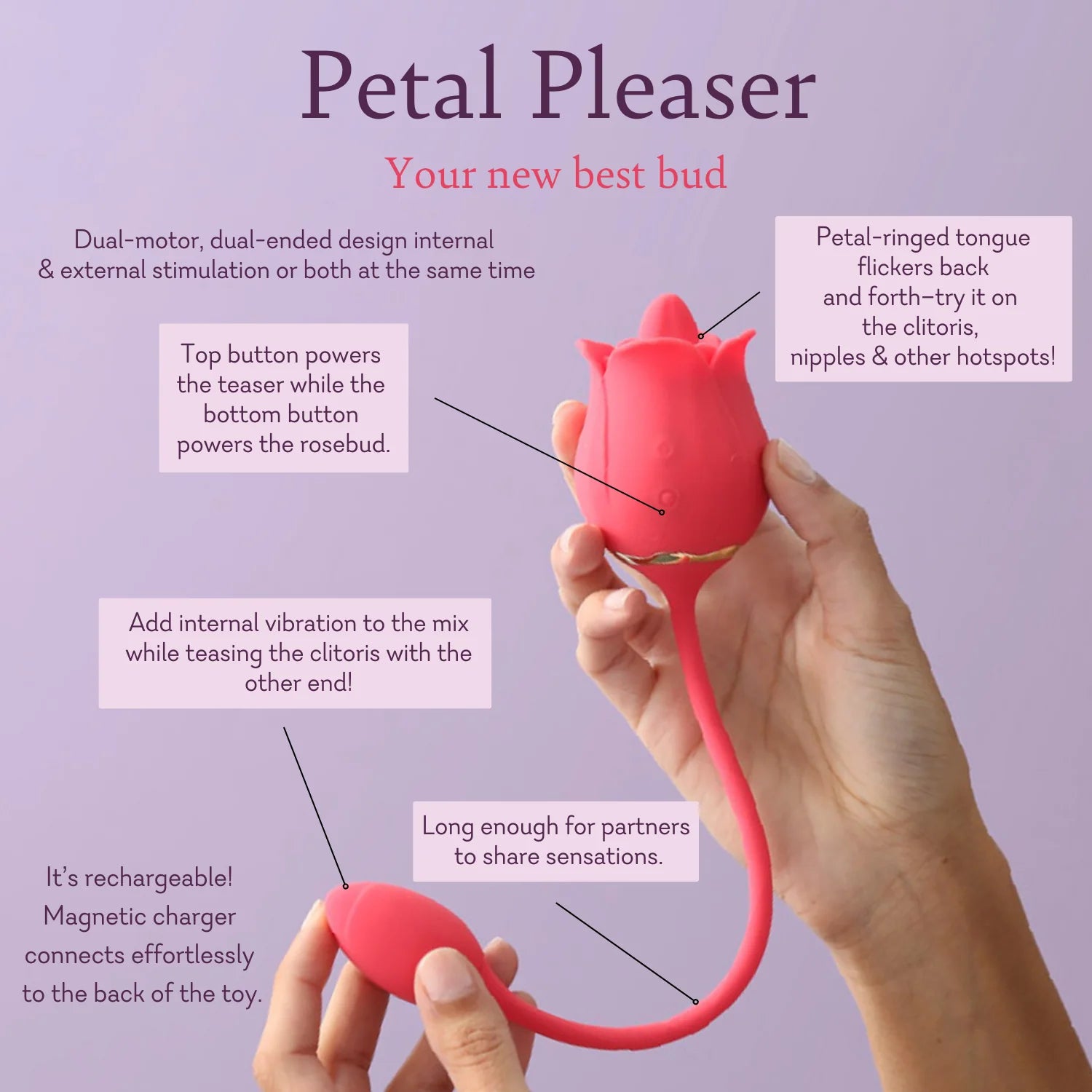 ● Dual-motor, dual-ended design with a tongue-shaped teaser on one end and a rosebud-shaped vibrating bullet on the other.